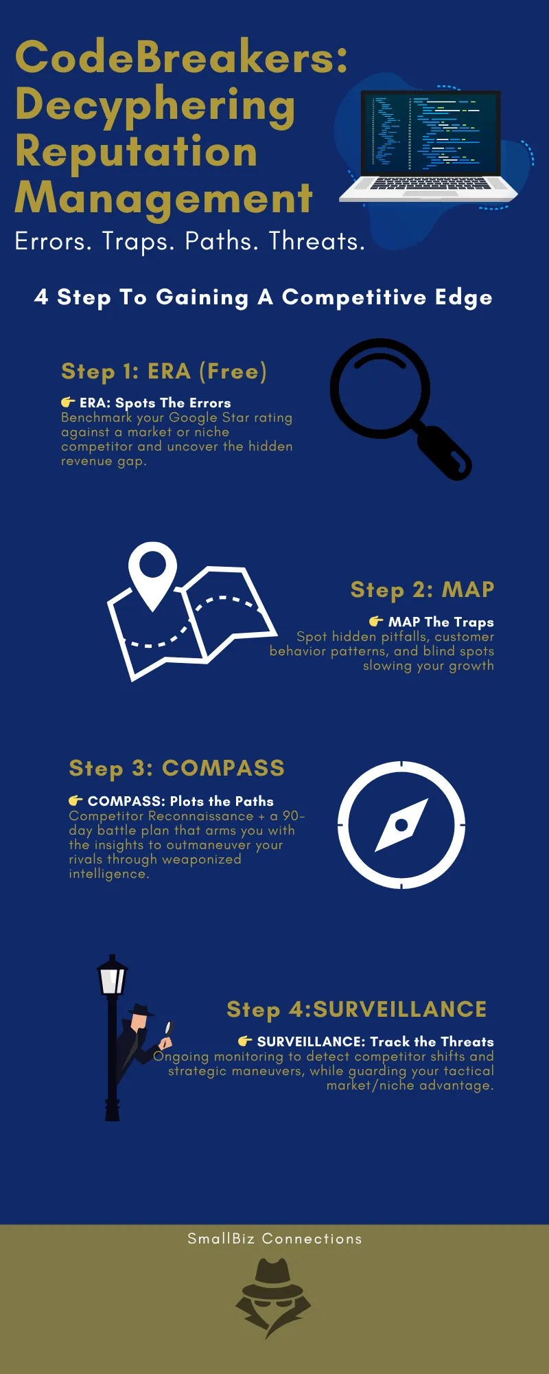 Market Intelligence is our ongoing analysis of your competitors' online strategies. We monitor their review response patterns, listing strength, and customer engagement. These insights are fed directly into your COMPASS Report, giving you a clear playbook to outperform them.